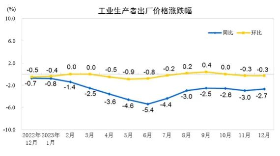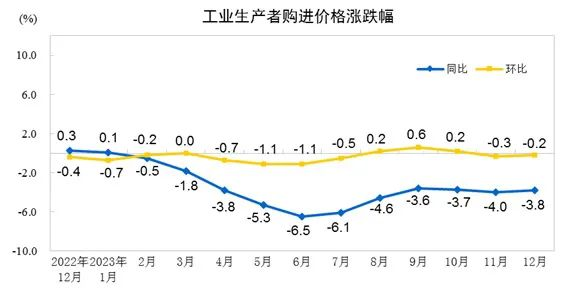 2023年12月份,全國(guó)工業(yè)生產(chǎn)者出廠價(jià)格同比下降2.7%,環(huán)比下降0.3%;工業(yè)生產(chǎn)者購(gòu)進(jìn)價(jià)格同比下降3.8%,環(huán)比下降0.2%。2023年全年,工業(yè)生產(chǎn)者出廠價(jià)格比上年下降3.0%,工業(yè)生產(chǎn)者購(gòu)進(jìn)價(jià)格下降3.6%。