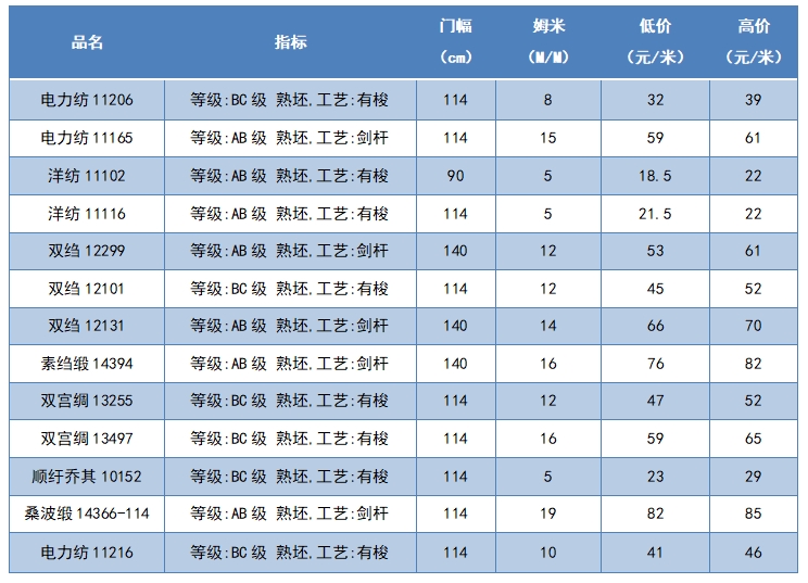 本周綢緞指數(shù)協(xié)作單位成交價格區(qū)間