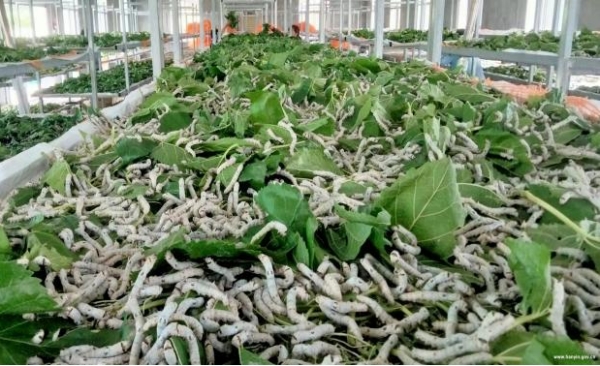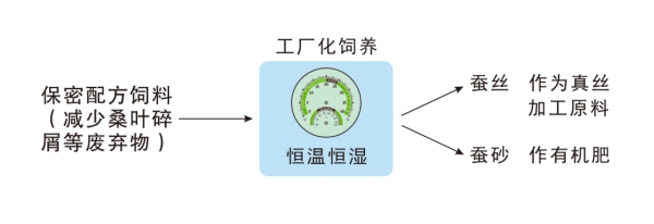 工廠化養(yǎng)蠶是以現(xiàn)代農(nóng)業(yè)科技理念,創(chuàng)建了高效率、低成本、一體化的現(xiàn)代繭絲生產(chǎn)新技術(shù)體系,系統(tǒng)集成品種、飼料、生產(chǎn)工藝、防病體系、環(huán)境控制、人工智能等多項(xiàng)創(chuàng)新技術(shù)打破傳統(tǒng)養(yǎng)蠶季節(jié)性,實(shí)現(xiàn)365天,天天可養(yǎng)蠶,天天可收繭。和傳統(tǒng)養(yǎng)蠶相比,企業(yè)采用豆腐渣、玉米粉、桑粉、復(fù)合維生素等,通過(guò)特殊配比制成的保密配方飼料替代桑葉,生產(chǎn)車間代替養(yǎng)蠶室,以自動(dòng)化養(yǎng)蠶裝備代替蠶具,基本消除了傳統(tǒng)養(yǎng)蠶過(guò)程桑葉碎屑、破舊蠶匾、蠶架等廢棄物,同時(shí)通過(guò)飼料配比的調(diào)整,有效減少蠶砂中的雜質(zhì),提升蠶砂可利用水平。