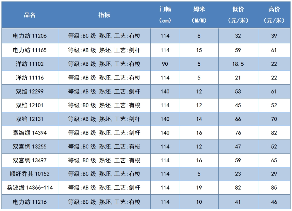 本周綢緞指數(shù)協(xié)作單位成交價格區(qū)間