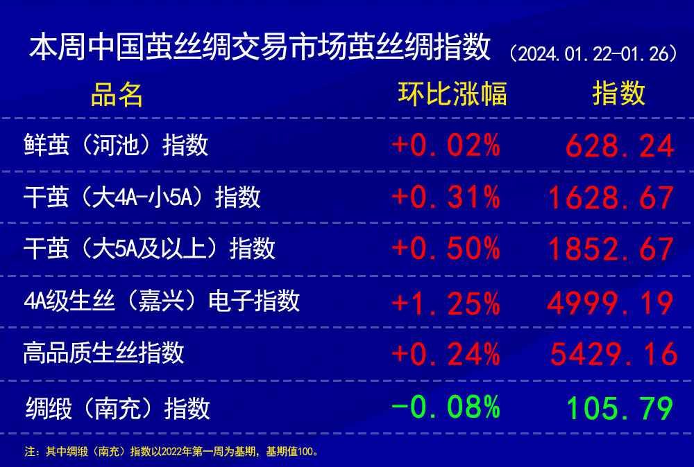 鮮繭指數(shù)上,根據(jù)協(xié)作單位所報,主要由于生絲價格部分有上漲,整體帶動倒推出的鮮繭價格指數(shù)本周略收紅上漲。