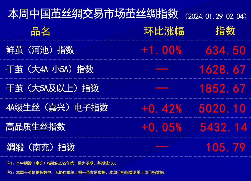 干繭指數(shù)上,本周協(xié)作單位無上報(bào)貿(mào)易數(shù)據(jù),價(jià)格指數(shù)沿用上周數(shù)值。據(jù)反映,有繭單位所報(bào)繭本持高,與用繭單位價(jià)格協(xié)商有難度,影響成交。