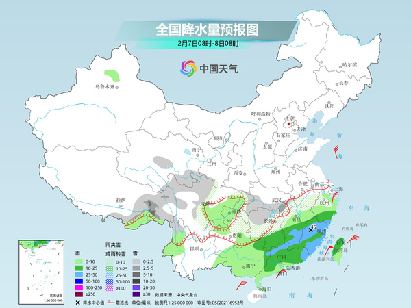 后天,西藏東南部、江淮西部、江漢東部、江南北部等地部分地區(qū)有小到中雪或雨夾雪,其中,西藏東南部等地部分地區(qū)有大雪。江南大部、西南地區(qū)東部、華南、臺灣島等地部分地區(qū)有小到中雨,其中,江西南部、福建大部、廣東西北部等地部分地區(qū)有大雨。