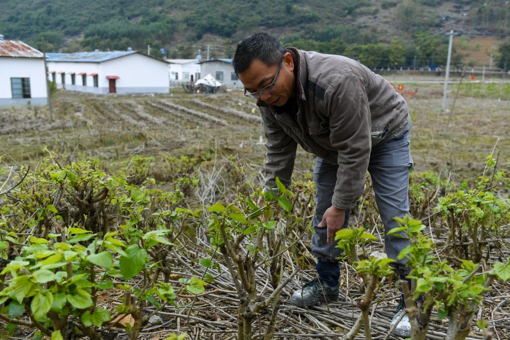 1月26日,在廣西河池市環(huán)江毛南族自治縣大才鄉(xiāng)新坡村,村民黃流恩在田間查看桑樹生長情況