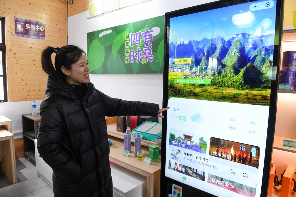 1月26日,在廣西河池市環(huán)江毛南族自治縣大才鄉(xiāng)新坡村的游客中心,“鄉(xiāng)村CEO”梁秋艷介紹粵桂數(shù)字農(nóng)文旅平臺(tái)