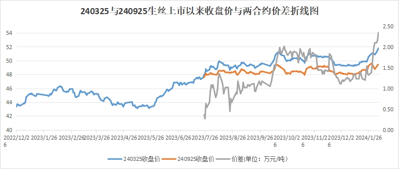 同時,盤面上2023年度繭期的240325生絲合約價格持續(xù)高于2024年度繭期的240925生絲價格,遠期貼水明顯,值得關注。