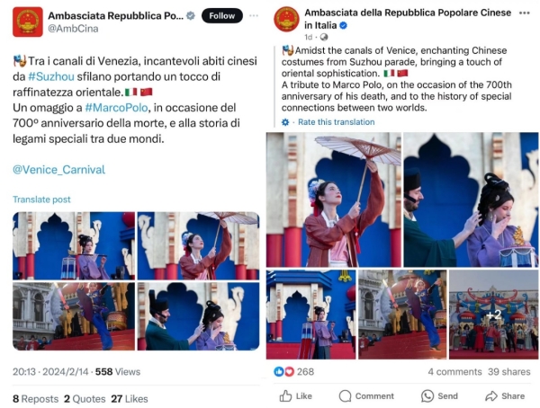 中國(guó)駐意大利大使館官微、facebook和twitter對(duì)蘇州絲綢服飾威尼斯狂歡節(jié)巡游做了報(bào)道。中國(guó)駐米蘭總領(lǐng)事館官微也進(jìn)行了報(bào)道。