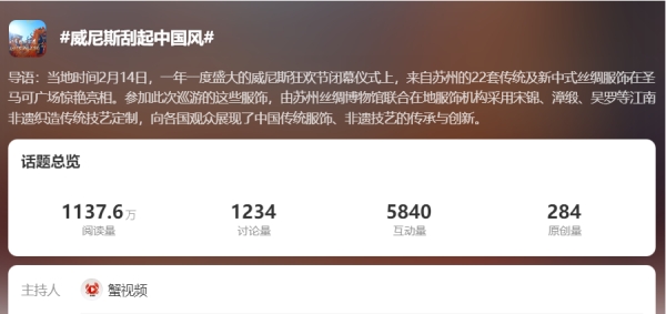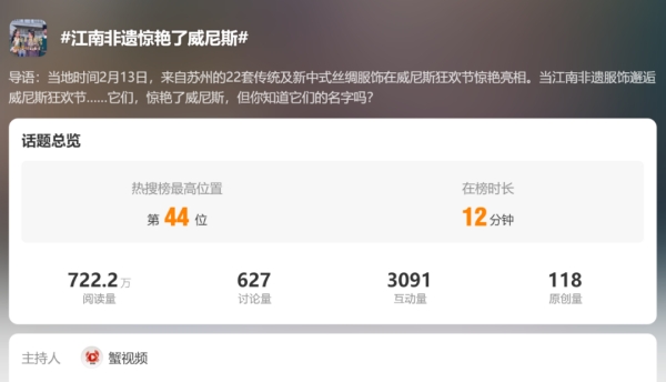 蘇州廣電傳媒集團(tuán)(總臺(tái))微博“江南非遺驚艷了威尼斯”“威尼斯刮起中國(guó)風(fēng)”兩個(gè)話題閱讀量1859.8萬(wàn)。其中“江南非遺驚艷了威尼斯”登上微博全國(guó)熱搜,熱搜榜最高位置第44位。