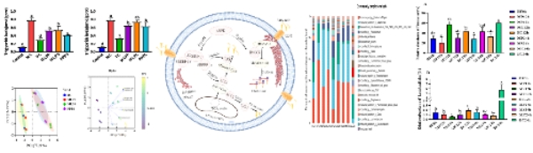 體外模擬消化和結(jié)腸發(fā)酵發(fā)現(xiàn),桑葉多酚-多糖可促進(jìn)短鏈脂肪酸生成,調(diào)節(jié)脂質(zhì)代謝優(yōu)勢(shì)菌群從而影響宿主健康;HepG-2脂肪肝細(xì)胞模型表明,桑葉多酚-多糖可抑制脂肪肝HepG2細(xì)胞脂肪生成,主要通過(guò)HMGCR/ ACC信號(hào)通路發(fā)揮協(xié)同作用。建立Caco-2/HepG 2共培養(yǎng)模型,桑葉多酚-多糖對(duì)TG有較好清除效果,代謝組學(xué)分析發(fā)現(xiàn)核心差異代謝物包括甘油磷脂、γ-氨基丁酸-甜菜黃素,木犀草素等。KEGG通路分析揭示MAPK、NF-κB等信號(hào)通路參與桑葉多酚-多糖脂質(zhì)穩(wěn)態(tài)協(xié)同作用的發(fā)揮。