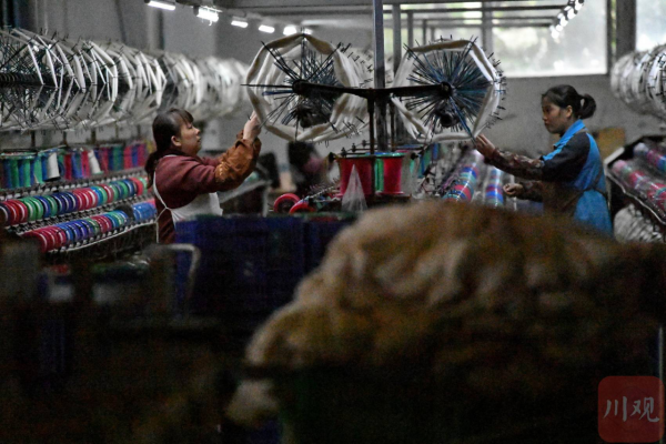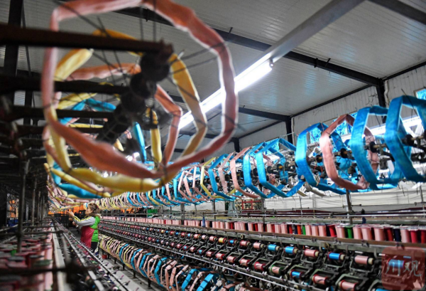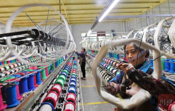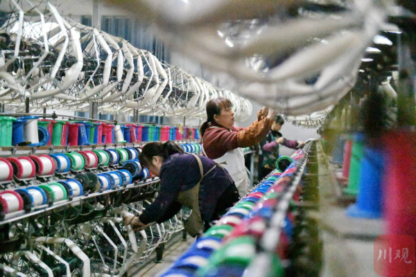 2月21日,在位于四川省南充市嘉陵工業(yè)集中區(qū)的四川順成紡織有限公司紡織車間,工人正在翻絲