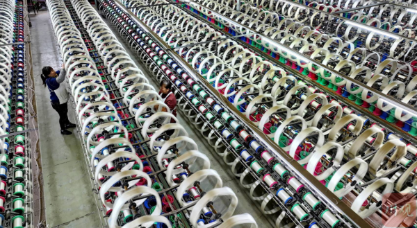 2月21日,在位于四川省南充市嘉陵工業(yè)集中區(qū)的四川順成紡織有限公司紡織車間,工人正在進(jìn)行并攆絲