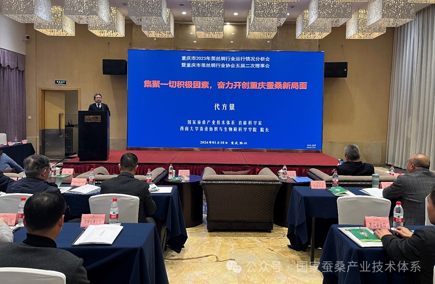 歲序更新,新元肇啟。2024年1月18日,國(guó)家蠶桑產(chǎn)業(yè)技術(shù)體系首席科學(xué)家代方銀教授應(yīng)邀赴重慶市蠶桑產(chǎn)業(yè)龍頭基地黔江區(qū)參加“重慶市2023年繭絲綢行業(yè)運(yùn)行情況分析會(huì)暨重慶市繭絲綢行業(yè)協(xié)會(huì)五屆二次理事會(huì)”并作培訓(xùn)報(bào)告。他以“集聚一切積極因素,奮力開(kāi)創(chuàng)重慶蠶桑新局面”為題,從“鑒史知責(zé),立志振興”“抓住機(jī)遇,找準(zhǔn)定位”“發(fā)揮優(yōu)勢(shì),全面發(fā)力”“補(bǔ)鏈強(qiáng)鏈,后來(lái)居上”四個(gè)方面展開(kāi),剖析了重慶市蠶桑絲綢產(chǎn)業(yè)在新時(shí)代“大蠶?!比种械陌l(fā)展定位和機(jī)遇,勉勵(lì)重慶市蠶桑絲綢行業(yè)同仁不忘初心使命,檢視短板弱項(xiàng),發(fā)展新質(zhì)生產(chǎn)力,弘揚(yáng)“絲路精神”,發(fā)揚(yáng)“干”字精神,團(tuán)結(jié)奮斗,奮力開(kāi)創(chuàng)重慶蠶桑新局。