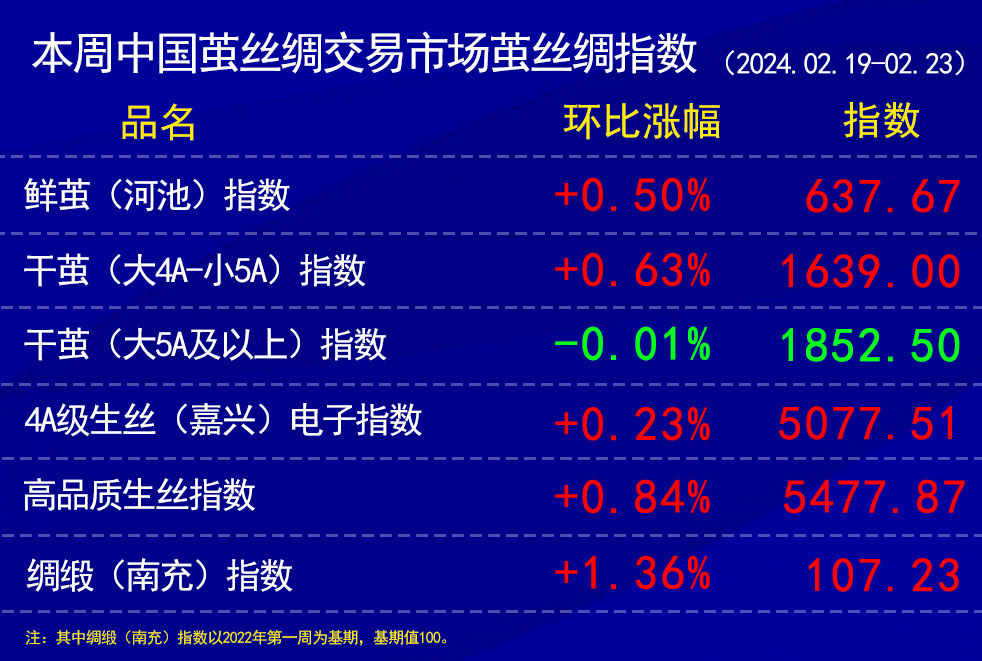 干繭指數(shù)上,龍年開工后,廣西本地繭站和云南、四川、浙江等地有繭的單位所報(bào)繭本普遍較年前有所提高,距離絲廠接受成交仍有一定距離,另一方面,本周還在新年之中,用繭單位預(yù)計(jì)一般到十五以后詢價(jià)成交的積極性更大些。所以,本周協(xié)作單位所報(bào)成交很小,以浙江繭(3A級繭)和廣西本地繭(大4A小5A 繭)為主。轉(zhuǎn)換后,兩個(gè)等級的干繭指數(shù)分別有所上漲/持平。