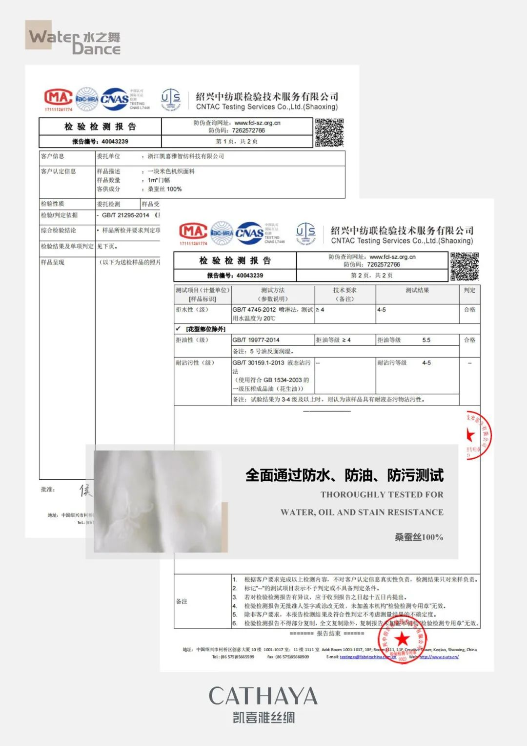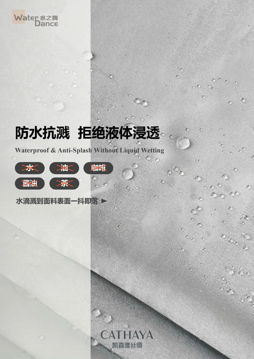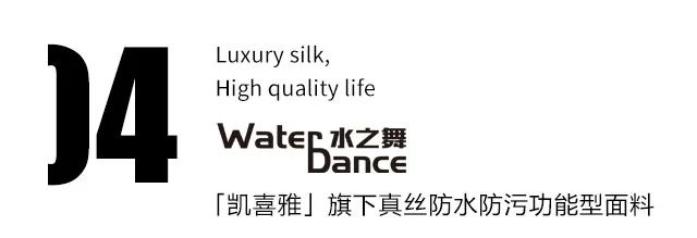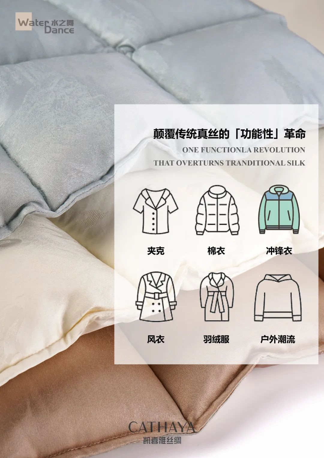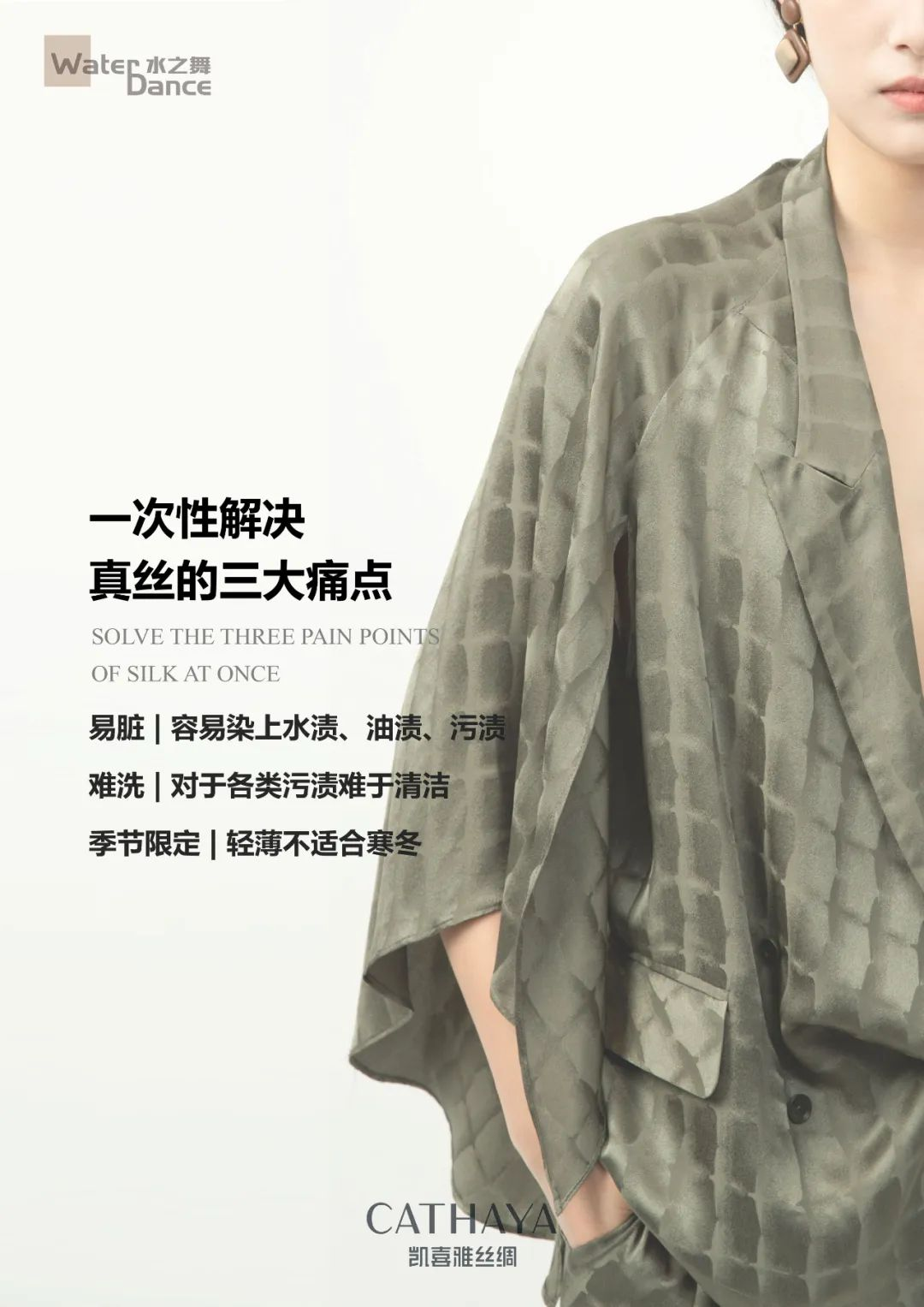 凱喜雅秉持著科技創(chuàng)新 、可持續(xù)發(fā)展理念深耕絲綢紡織全產業(yè)鏈 。開發(fā) 「水之舞 」真絲功能性面料 , 改善了傳統(tǒng)真絲面料容易臟、難打理 、受季節(jié)限定 ,讓絲綢使用更廣泛、更耐用。