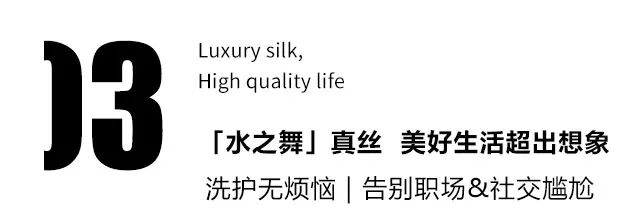 在職場及社交場合,很多意外會弄臟衣服,造成尷尬,「水之舞」真絲面料能幫助職場女性輕松應對,有效減少油污和洗滌產品對于真絲的傷害。