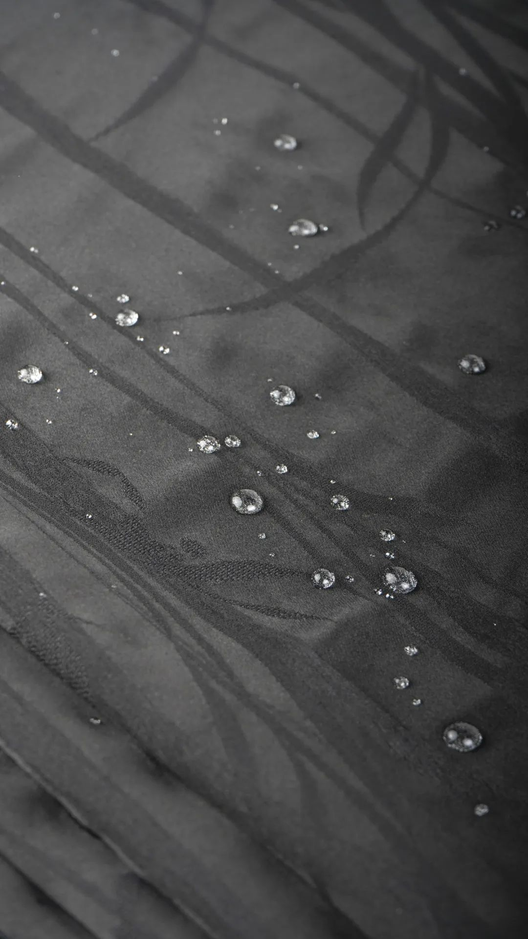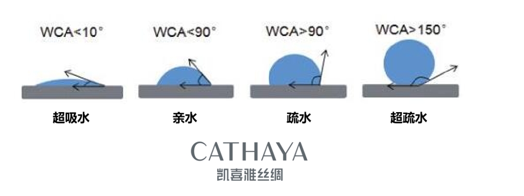 利用凱喜雅的黑科技,在絲綢表面形成亞微觀級粗糙凸起,構建出了像荷葉表面的超疏水表面保護膜。當液體落到絲綢上,就像水珠滑落在荷葉上一樣 ,在表面變成了液滴脫落下來。而不會滲透到面料內部,從而達到防水效果。