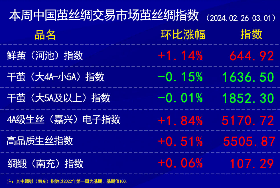 高品質(zhì)生絲指數(shù)上,本周部分協(xié)作單位有不等的提價(jià)行為,成交環(huán)比上周顯得活躍些,同時(shí)部分協(xié)作單位由于基本無(wú)存貨年后剛開(kāi)始生產(chǎn)、成交內(nèi)部使用、價(jià)格仍處于協(xié)商階段、產(chǎn)品已預(yù)先售出等原因無(wú)上報(bào)成交。整體上,帶動(dòng)指數(shù)環(huán)比上周繼續(xù)有所上漲。