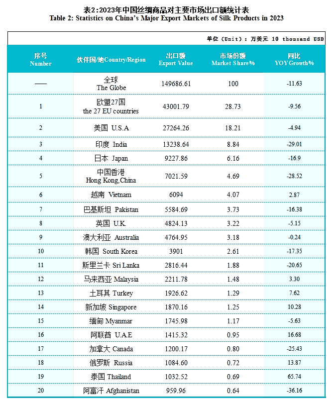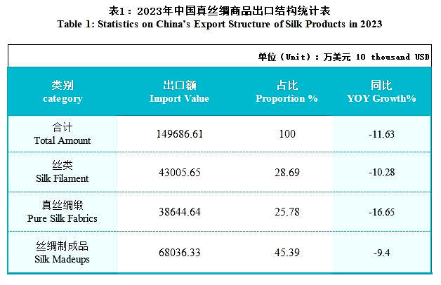 據(jù)中國(guó)海關(guān)統(tǒng)計(jì),2023年,我國(guó)真絲綢商品進(jìn)出口總額為18.27億美元,同比下降11.1%,占我紡織品服裝進(jìn)出口總額的0.57%。其中,出口額為14.97億美元,同比下降11.5%,占我紡織品服裝出口額的0.50%;進(jìn)口額為3.28億美元,同比下降9.17%,占紡織品服裝進(jìn)口額的1.49%。