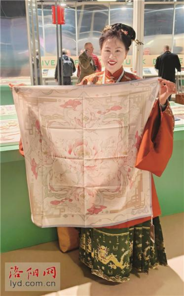 “這是我們最新研發(fā)的專利產(chǎn)品——牡丹花香絲綢制品,大家看到的是‘國(guó)色天香系列’絲巾、面紗?!痹谡箷?huì)現(xiàn)場(chǎng),洛陽(yáng)新嵩州絲綢科技有限公司(以下簡(jiǎn)稱嵩州絲綢)負(fù)責(zé)人楚小莉信心滿滿,向圍觀的客商介紹來(lái)自洛陽(yáng)的“古典美”。楚小莉介紹,因?yàn)椴捎昧颂厥夤に?,絲綢上的牡丹花散發(fā)著獨(dú)特的香氣,讓不少歐洲客商倍感新奇。