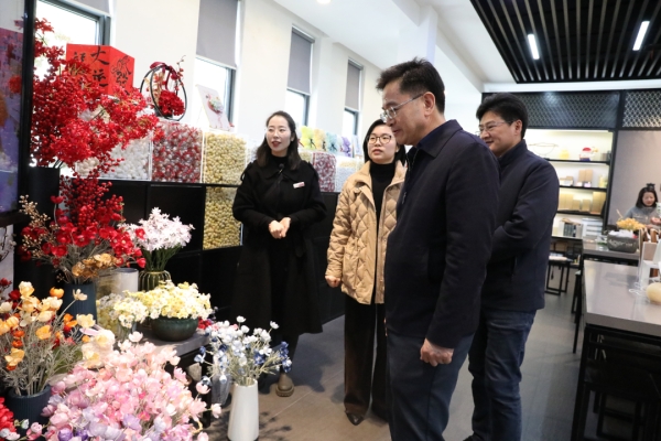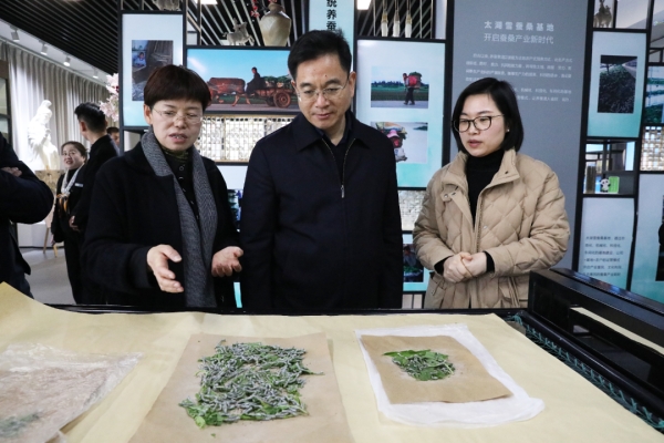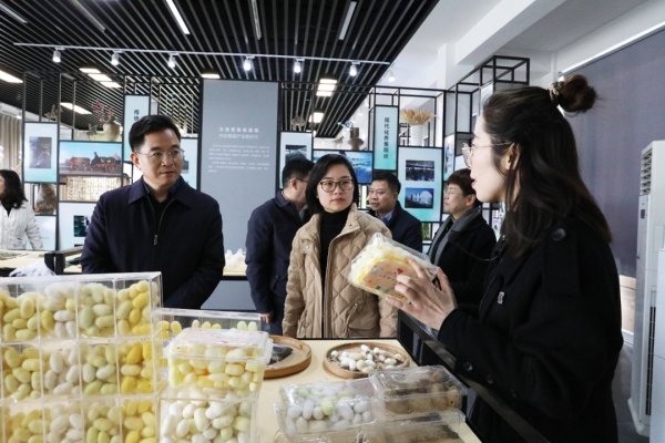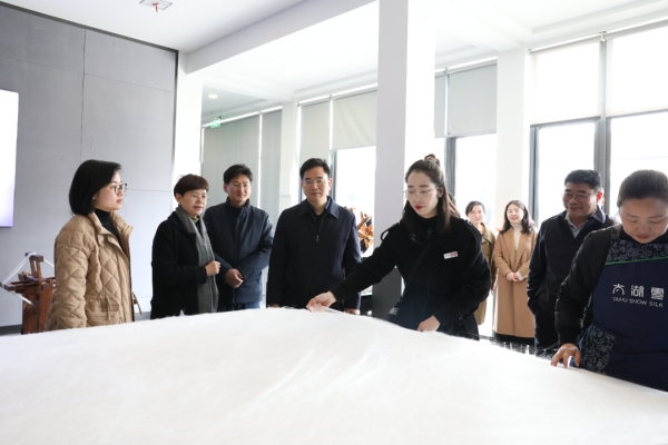 在太湖雪蠶桑文化園,許益軍一行參觀了科普長廊、育蠶課堂、繭藝工坊等,聽取震澤鎮(zhèn)源遠流長的蠶桑絲綢文化介紹,實地感受剝繭抽絲、拉綿制被等傳統(tǒng)工藝。太湖雪蠶桑文化園是中國首個以蠶桑為主題,集農(nóng)業(yè)示范、蠶??蒲?、文化休閑、科普展示、生態(tài)旅游為一體的特色生態(tài)園,通過4000平方米展示館、2000畝桑園、2000畝果園、2000畝稻田再現(xiàn)江南魚米之鄉(xiāng)、絲綢之府。