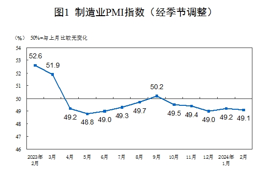 國家統(tǒng)計局3月1日公布2024年2月中國采購經(jīng)理指數(shù)運行情況。2月份,制造業(yè)采購經(jīng)理指數(shù)(PMI)為49.1%,比上月下降0.1個百分點。