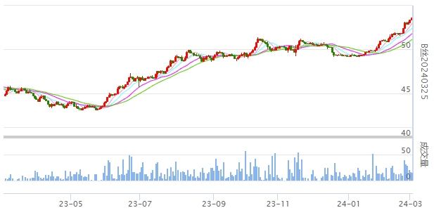 今日(2024年03月04日,周一)中國繭絲綢交易市場生絲指數(shù)上漲0.32%收于5187.15點。B絲(商檢4A級生絲):240325合約上漲0.24萬元報收于53.61萬元;240925合約上漲0.12萬元報收于49.92萬元;250325合約上漲0.18萬元報收于50.22萬元。
