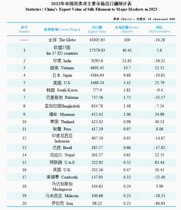 中國 | 2023年中國絲類對主要市場出口情況統(tǒng)計
