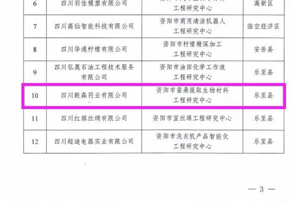 近日,四川省資陽市發(fā)展改革委發(fā)布了《關于組織開展2023年度資陽市工程研究中心申報工作的通知》,由四川默森藥業(yè)有限公司申報的“資陽市蠶桑提取生物材料工程研究中心”榜上有名,成為資陽市首批通過的十二家工程研究中心之一。