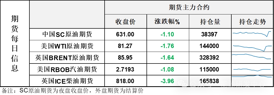 【1】WTI主力原油期貨收跌1.46美元,跌幅1.76%,報81.27美元/桶;布倫特主力原油期貨收跌1.43美元,跌幅1.64%,報85.95美元/桶;INE原油期貨收跌1.1%,報631元。