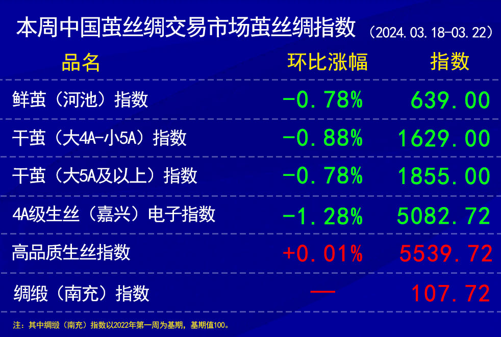 今日(2024年03月22日,周五)中國繭絲綢交易市場生絲指數(shù)微跌0.09%收于5082.72點(diǎn),本周生絲指數(shù)下跌1.28%。B絲(商檢4A級生絲):240325合約下跌0.06萬元報收于52.53萬元;240925合約上漲0.15萬元報收于49.08萬元;250325合約下跌0.12萬元報收于49.29萬元。