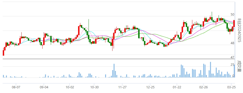 今日(2024年03月27日,周三)中國繭絲綢交易市場生絲指數(shù)上漲0.31%收于4978.02點(diǎn)。B絲(商檢4A級生絲):240425合約報(bào)平收于49.59萬元;240925合約上漲0.45萬元報(bào)收于49.71萬元;250325合約上漲0.72萬元報(bào)收于50.07萬元。