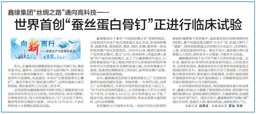 鑫緣集團的每個生產(chǎn)環(huán)節(jié)都十分講究科技含量。近年來,集團有40多項科研成果榮獲市級以上科技進步獎,天然彩色繭絲、桑蠶繭絲綜合開發(fā)等多項成果更是達到國際領先水平。蠶絲蛋白骨釘開啟了我國第三代高性能生物醫(yī)用材料(蠶絲蛋白)的新篇章,有望打破我國醫(yī)療器械原材料及產(chǎn)品嚴重依賴進口、可降解骨固定材料市場長期被國外公司占據(jù)的局面。