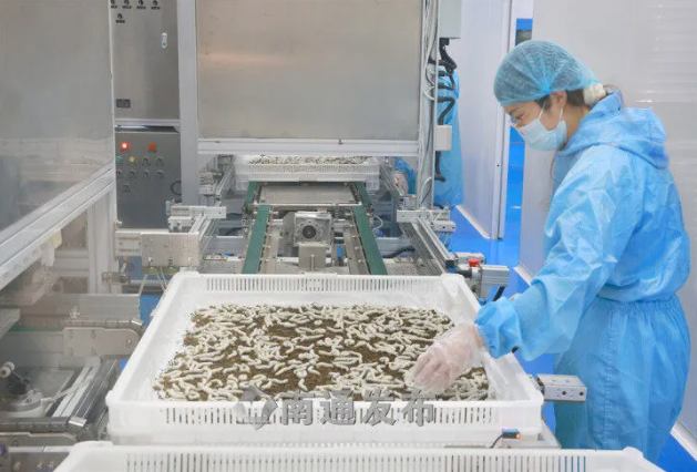 走進集團10萬級凈化車間,一批批不同生長階段的蠶被機械臂置于飼養(yǎng)盤中,盤底鋪有泥巴狀軟綿綿的專用飼料,整個恒溫恒濕無菌的“大宅子”里,機器人替代了“蠶娘”,飼養(yǎng)流程都通過總控制臺自動運行,自動喂料、上蔟、采繭設備協(xié)同作業(yè)。儲呈平表示,蠶絲蛋白骨釘是要植入人體的,原料安全十分重要,不能有半點差池。