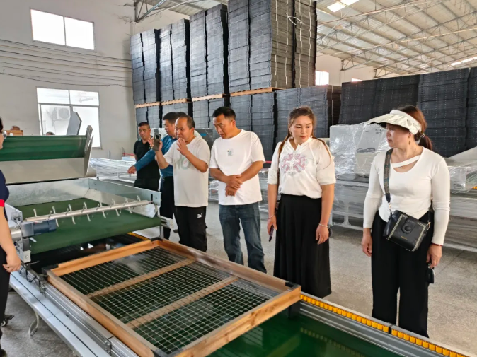 最后,在黃副總陪同下,考察團(tuán)還參觀了養(yǎng)蠶生產(chǎn)線的工作原理,這套養(yǎng)蠶生產(chǎn)線主要由控制箱、進(jìn)框口、出框口、蠶框輸送帶、喂葉機(jī)、撒石灰機(jī)、均葉機(jī)等組成,3分鐘就可以實(shí)現(xiàn)12層蠶框自動(dòng)堆疊、自動(dòng)撒石灰消毒、自動(dòng)喂葉、分框提青,較地面養(yǎng)蠶面積節(jié)省5倍,智能化控制,流水線喂養(yǎng),方便快捷。同時(shí),考察團(tuán)還詳細(xì)了解了分體式小蠶飼育機(jī)、高速切葉機(jī)的工作原理,表示要把這些省力化蠶具設(shè)備的情況匯總,回到他們當(dāng)?shù)剡M(jìn)行宣傳和推廣,林勝堂自研的省力化設(shè)備確實(shí)能夠幫助蠶農(nóng)提量增產(chǎn),降低人工成本,值得推廣和學(xué)習(xí)。