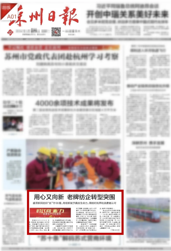 近日,《蘇州日?qǐng)?bào)》關(guān)注盛澤,頭版刊文《用心又向新 老牌紡企轉(zhuǎn)型突圍 盛澤新民紡織“絲”守66載,用創(chuàng)新賦予真絲生命力,得到時(shí)尚界和消費(fèi)者認(rèn)可》。