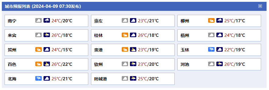 南寧市:今天白天多云到陰天,今天晚上陰天轉(zhuǎn)小雨,東北風2級,最高氣溫24℃,最低氣溫19℃。
