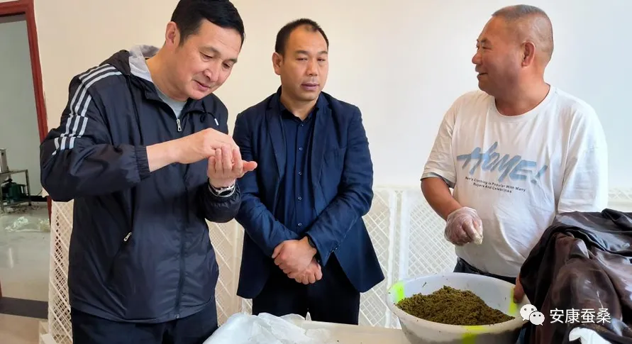 在全面查看和了解大營盤蠶桑專業(yè)合作社的桑園狀況、管理情況和蠶室設(shè)施條件及2023年生產(chǎn)情況后,陳康鼓勵合作社要抓住目前繭絲市場行情有利時機(jī)和擁有500畝優(yōu)良品種桑園基礎(chǔ)及良好的交通、勞力等生產(chǎn)要素,加強(qiáng)養(yǎng)蠶設(shè)施建設(shè),管好用好現(xiàn)有桑樹資源,多產(chǎn)葉、多養(yǎng)蠶、多產(chǎn)繭、多延鏈,助力蠶農(nóng)增收、產(chǎn)業(yè)增效。一要優(yōu)化大蠶飼養(yǎng)方式,將養(yǎng)地蠶轉(zhuǎn)變?yōu)樾Q臺育,充分利用蠶室空間和桑葉資源,擴(kuò)大養(yǎng)蠶規(guī)模,在同一蠶室內(nèi),蠶臺育比地面育可提高養(yǎng)蠶量1.5倍以上,同時每批次能夠縮短齡期3天左右。二要優(yōu)化養(yǎng)蠶組織方式,合作社重點抓好小蠶共育和示范引導(dǎo),合理確定自營養(yǎng)蠶規(guī)模,通過榜樣效益示范吸引當(dāng)?shù)卮迕褚浴胺底獾拱狈绞骄徒邪@,然后專養(yǎng)大中蠶增加養(yǎng)蠶批次擴(kuò)大生產(chǎn)規(guī)模,最終實現(xiàn)由“一枝獨(dú)秀”向“眾星拱月”集群發(fā)展,同時通過常態(tài)化養(yǎng)蠶將群眾牢牢吸附在產(chǎn)業(yè)發(fā)展中,變蠶桑產(chǎn)業(yè)由副業(yè)為主業(yè)。三要加大產(chǎn)業(yè)鏈?zhǔn)桨l(fā)展,縱向積極開發(fā)桑葉茶、蠶絲被等終端產(chǎn)品,延長產(chǎn)業(yè)鏈,橫向持續(xù)推進(jìn)糧桑復(fù)合經(jīng)營、桑園套種羊肚菌等模式,提高經(jīng)濟(jì)效益,同時穩(wěn)步推進(jìn)蠶桑研學(xué)、蠶桑文化展示等措施形成桑旅一體化、三產(chǎn)融合發(fā)展。