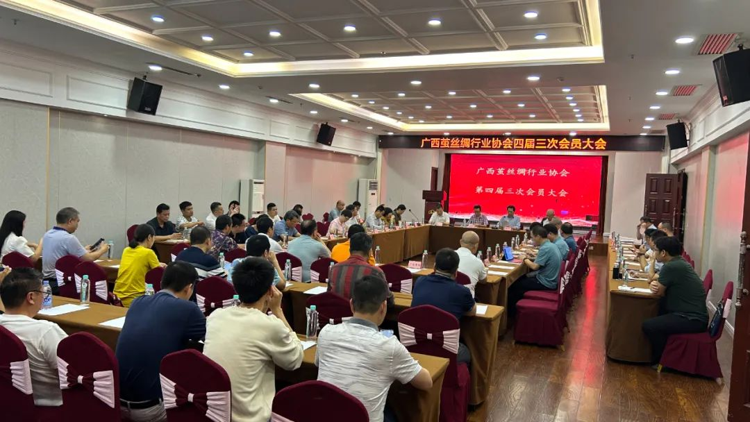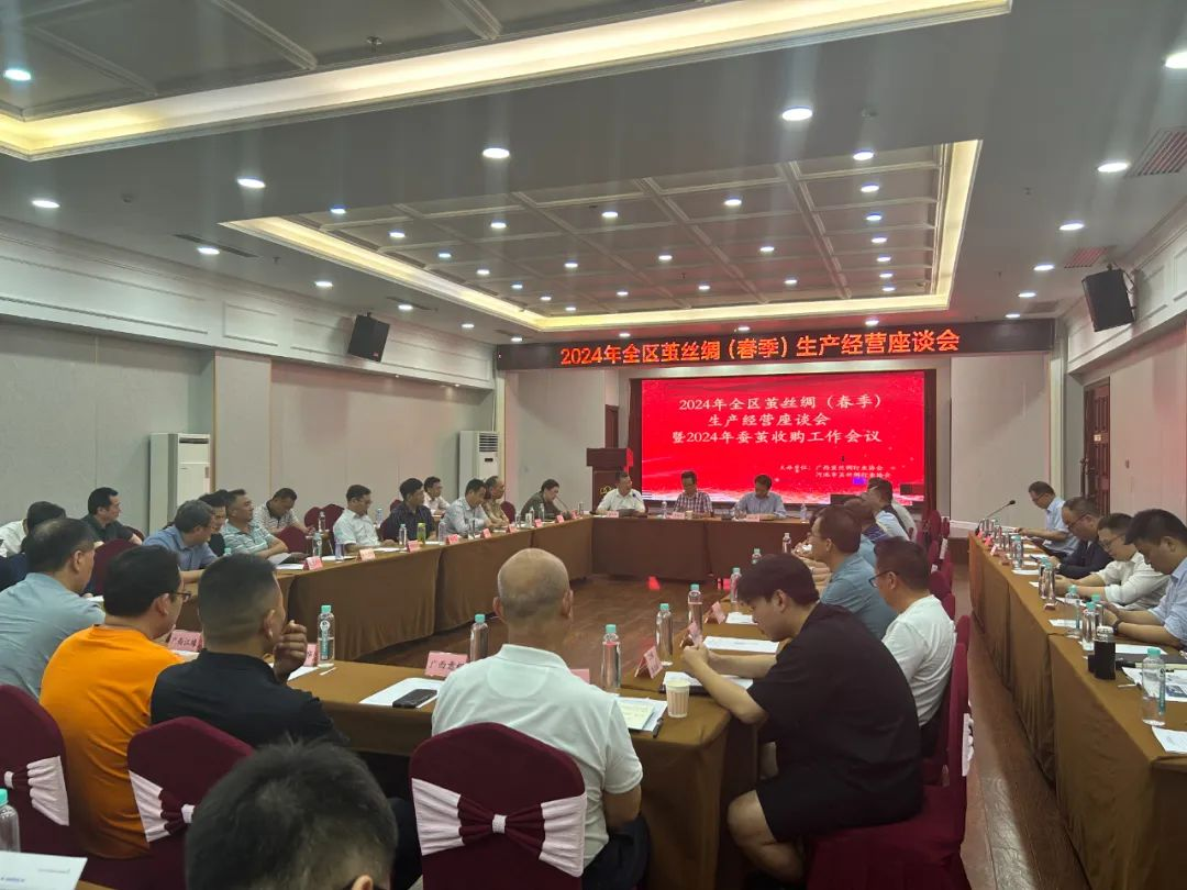 廣西春繭全面上市之際,為幫助企業(yè)做好今年絲綢生產(chǎn)經(jīng)營工作,便于企業(yè)間交流各地蠶繭生產(chǎn)、收購和企業(yè)生產(chǎn)經(jīng)營情況,更好把握市場趨勢,調(diào)整經(jīng)營思路,促進廣西絲綢行業(yè)健康發(fā)展,廣西繭絲綢行業(yè)協(xié)會于4月19日下午在河池市宜州區(qū)組織召開四屆三次會員大會、四屆五次理事會暨 2024 年全區(qū)繭絲綢(春季)生產(chǎn)經(jīng)營座談會。相關部門領導、協(xié)會領導和部分絲綢企業(yè)負責人等70余人參加了此次會議。廣西區(qū)工信廳梁維佳工程師等領導出席會議指導工作。