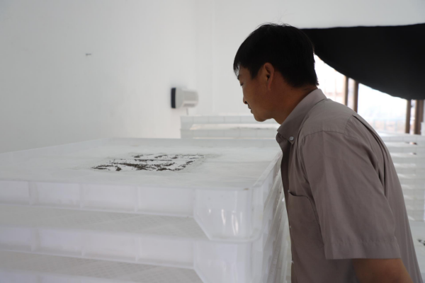 走進(jìn)舊營(yíng)村小蠶共育室,只見技術(shù)員穿梭在一排排蠶匾架間,細(xì)心地觀察蠶寶寶的生長(zhǎng)情況,幼蠶們則密密麻麻地匍匐在蠶匾里,安心休憩,等候新主人來接它們“回家”。