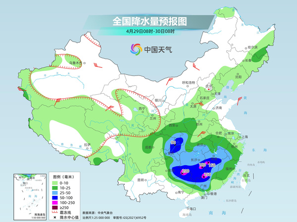 今明兩天(4月29日至30日),我國江南、華南等地降雨仍將持續(xù)且強對流天氣多發(fā),其中湖南、江西、廣東、廣西等地部分地區(qū)今天或?qū)⒂写蟊┯?,明天大到暴雨范圍將轉(zhuǎn)移至浙江、福建、廣東一帶。另外,伴隨著冷空氣到來,我國中東部地區(qū)氣溫繼續(xù)自北向南下滑,東北、華北多地今天最高氣溫仍將不足20℃,需注意添衣保暖。