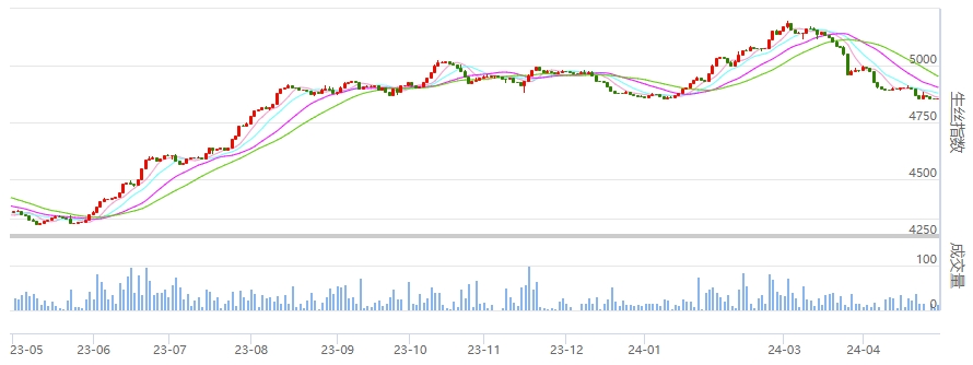 今日(周一)盤面各遠(yuǎn)近合約小幅漲跌不一,主力240925生絲合約收紅,成交量較昨日放大些。勞動節(jié)假期在即,盤面波動不大。
