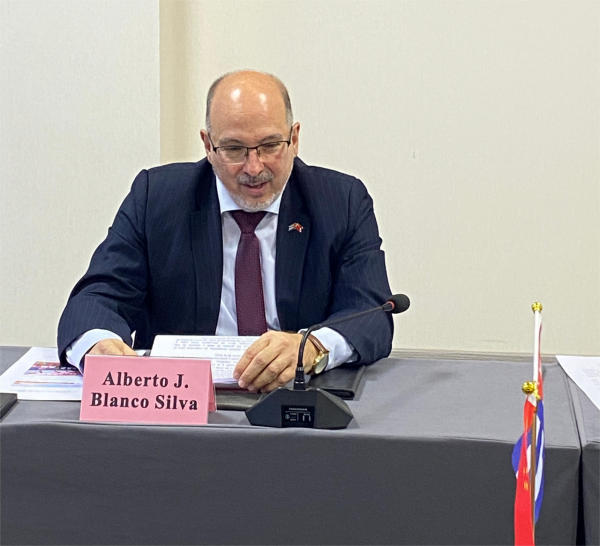 周南平對白詩德大使一行和所有參會嘉賓表示了熱烈歡迎和感謝,并介紹了學校的辦學歷史、辦學特色和取得的發(fā)展成效。他強調,中古蠶業(yè)科技合作項目受到中古兩國元首的高度關注,學校一直以來非常重視項目的發(fā)展。他回顧了自2014年7月習近平總書記將學校培育的桑樹種子作為國禮贈送給古巴革命領袖菲德爾·卡斯特羅,到2015年中國——古巴蠶??萍己献髦行脑趯W校的成立揭牌,再到2017年中古蠶桑項目榮獲古巴科學院國家一等獎,以及2023年學校舉辦中古蠶??萍己献髡搲纫幌盗欣锍瘫录?。周南平書記提出,這些合作成果已經(jīng)成為“一帶一路”倡議在拉美地區(qū)的典范和兩國友好關系的新象征,也體現(xiàn)了習近平總書記構建人類命運共同體理念的具體實踐。