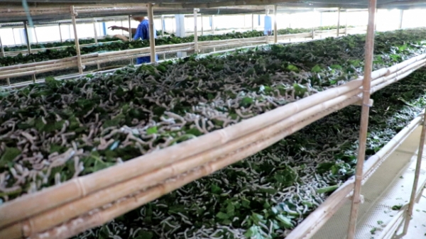 據(jù)了解,由旺鎮(zhèn)常村村小蠶共育示范基地實(shí)行集中統(tǒng)一共育、專人負(fù)責(zé)、專人管理。一鍵控溫裝置提高了小蠶的免疫力,共育后的小蠶發(fā)育整齊、發(fā)病率低。小蠶在共育室養(yǎng)到三齡階段,蠶農(nóng)領(lǐng)回去后,喂養(yǎng)十六天左右便可以結(jié)繭出售,為蠶農(nóng)縮短了飼養(yǎng)時(shí)間。