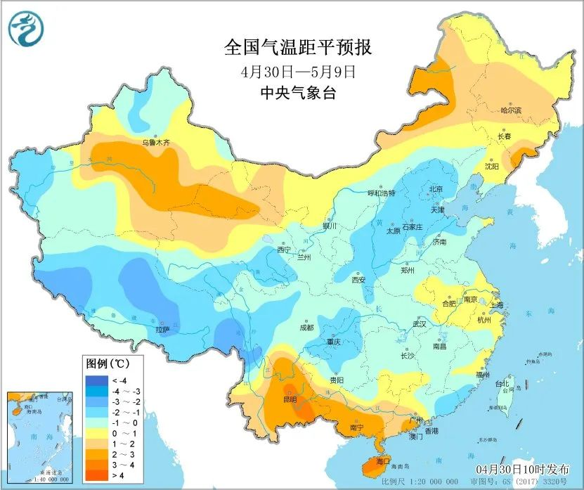 主要天氣過程:4月30日,浙江、江西南部、福建中南部、廣西東部、廣東中北部等地部分地區(qū)有大到暴雨,其中,福建南部、廣東北部等地部分地區(qū)有大暴雨;湖南南部、江西東部和南部、浙江東部、福建北部和西南部、廣西東部和南部、廣東西部和中北部等地的部分地區(qū)將有8級以上雷暴大風或冰雹天氣。5月1-2日,華南地區(qū)仍有中到大雨,局地暴雨或大暴雨。5月3-6日,中東部有一次大范圍降水過程,江南、華南有中到大雨、局部暴雨;西北地區(qū)東部、黃淮、江淮東部、華北中南部及東北地區(qū)南部有小到中雨,局地大雨。4-6日,內(nèi)蒙古中東部、華北、東北地區(qū)南部等地平均氣溫將下降4~8℃。5月8日前后,西南地區(qū)東部、江南西部、華南西部等地有小到中雨,部分地區(qū)有大雨或暴雨。