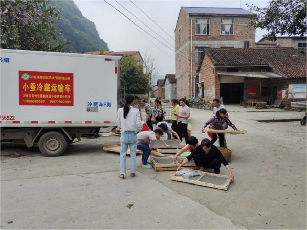 覃小賢用小蠶冷藏運(yùn)輸車發(fā)蠶現(xiàn)場(chǎng)