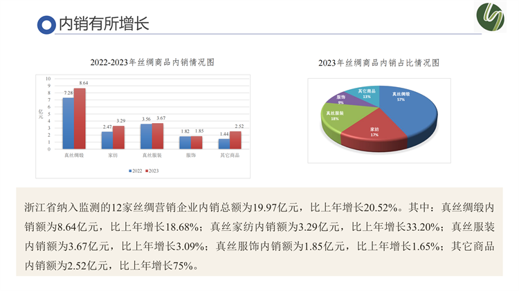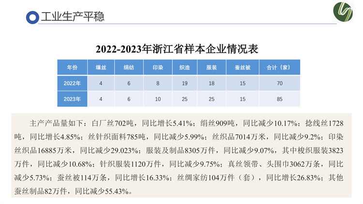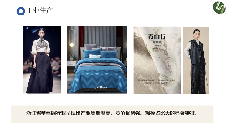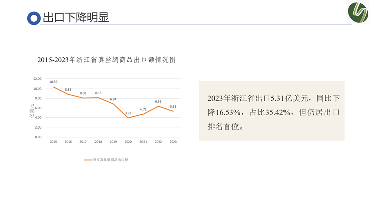 工業(yè)生產(chǎn)方面,浙江省繭絲綢行業(yè)呈現(xiàn)出產(chǎn)業(yè)集聚度高、競爭優(yōu)勢強、規(guī)模占比大的顯著特征。銷售上,呈現(xiàn)內(nèi)銷有所增長、出口下降明顯的特點,但絲綢商品出口額仍居出口省份排名首位。