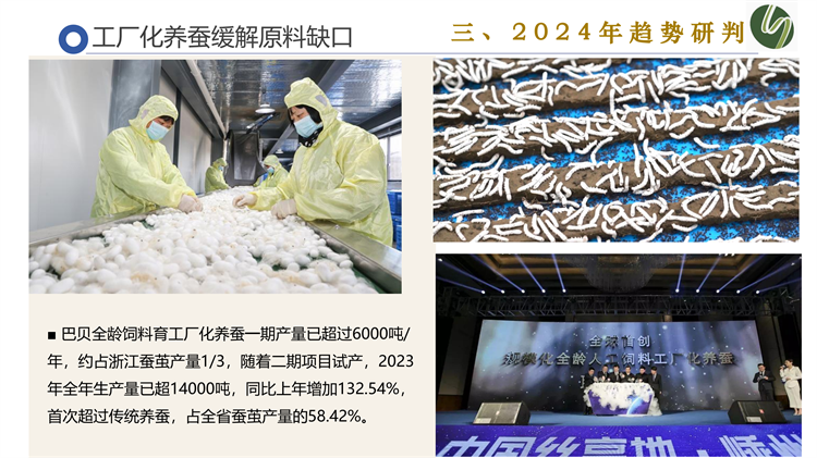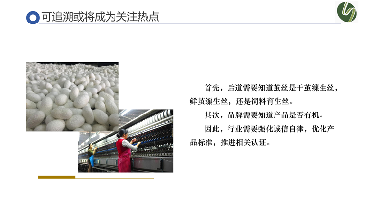 最后,吳會長重點圍繞工廠化養(yǎng)蠶緩解原料缺口、中國風流行促進絲綢消費、可追溯或?qū)⒊蔀殛P(guān)注熱點等維度對2024年進行趨勢研判。