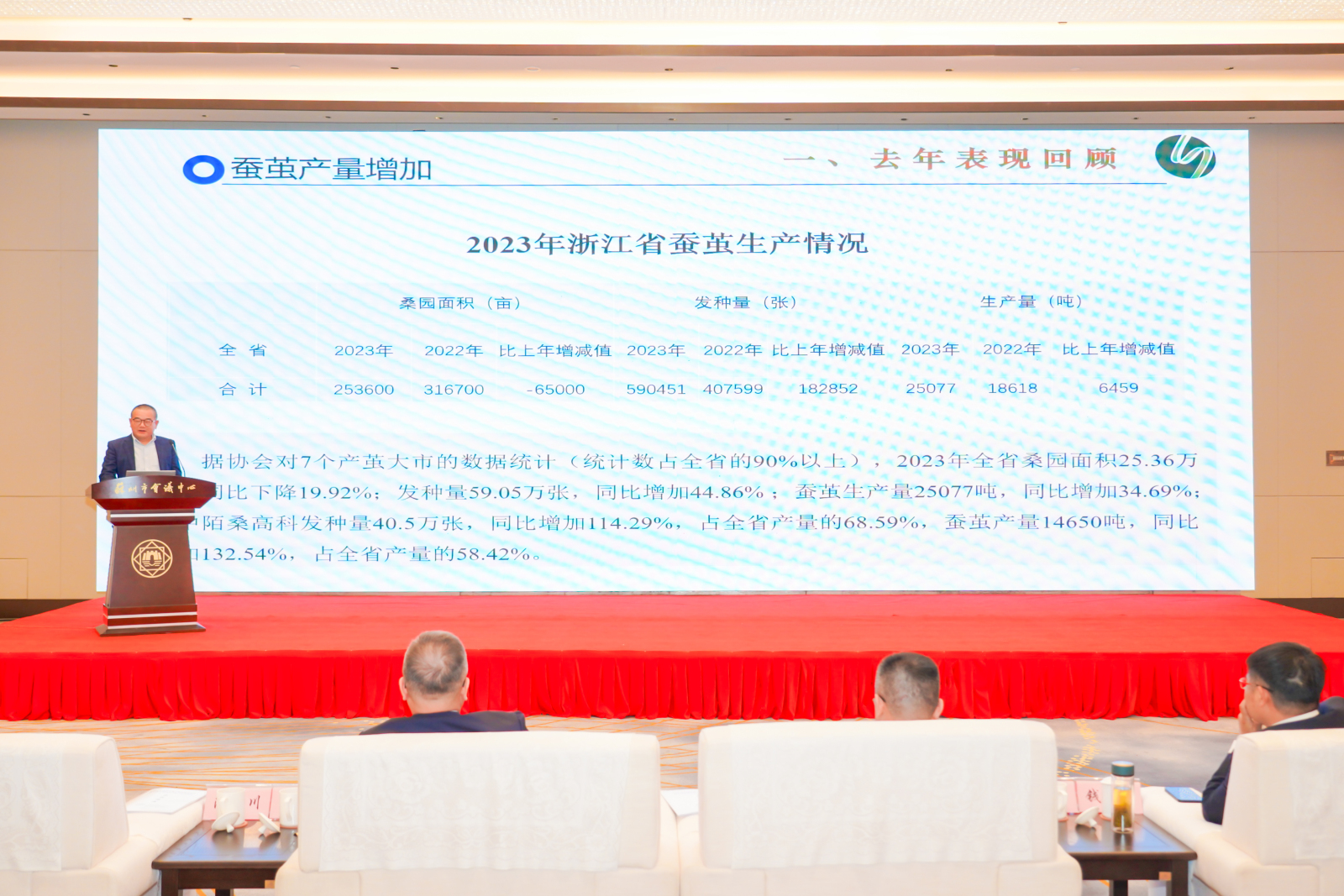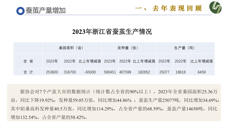 在23年行業(yè)表現(xiàn)上,吳會長介紹,據(jù)協(xié)會對7個產(chǎn)繭大市的數(shù)據(jù)統(tǒng)計(統(tǒng)計數(shù)占全省的90%以上),2023年全省桑園面積25.36萬畝,同比下降19.92%;發(fā)種量59.05萬張,同比增加44.86% ;蠶繭生產(chǎn)量25077噸,同比增加34.69%;其中陌桑高科發(fā)種量40.5萬張,同比增加114.29%,占全省產(chǎn)量的68.59%,蠶繭產(chǎn)量14650噸,同比增加132.54%,占全省產(chǎn)量的58.42%。