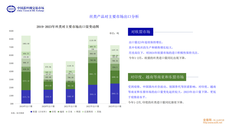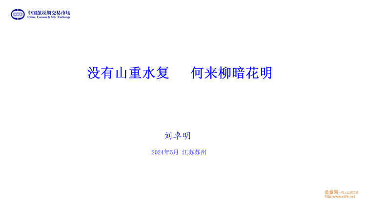他從桑苗、蠶種、蠶繭、生絲、綢緞、家紡和服裝等多方面介紹了2023年產(chǎn)業(yè)鏈的基本情況;從生絲電子指數(shù)、高品質(zhì)生絲指數(shù)、蠶繭指數(shù)、綢緞指數(shù)等維度分析了供應(yīng)鏈的運轉(zhuǎn)態(tài)勢;并將繭絲品種置于國際大宗商品和紡織原料中進行分析。對于2024年的趨勢展望,劉董又從行業(yè)最源頭至內(nèi)外銷以及出口和進口市場等方面進行重點分析。