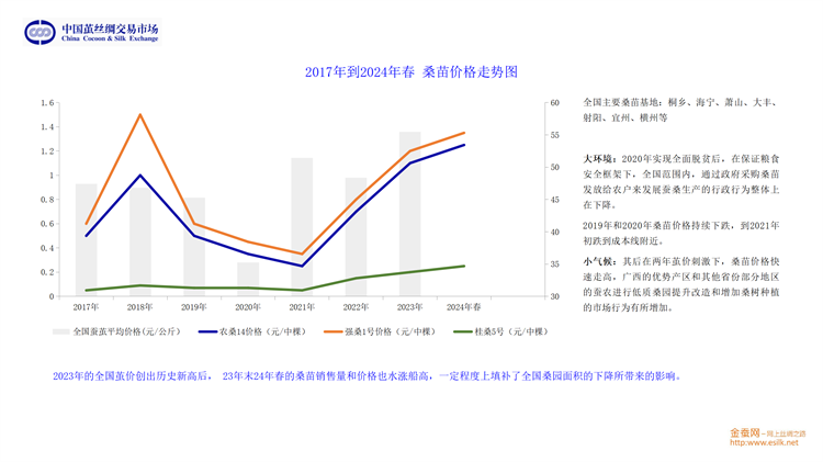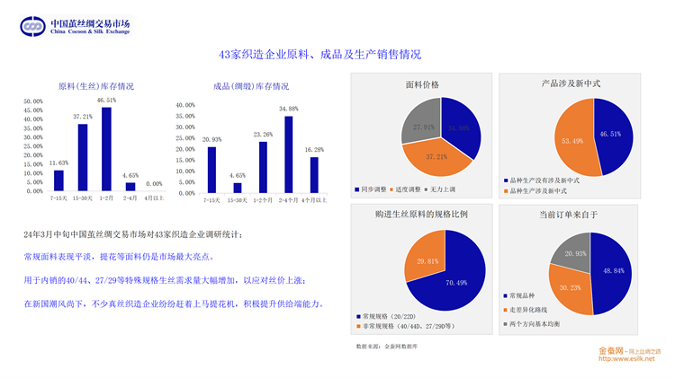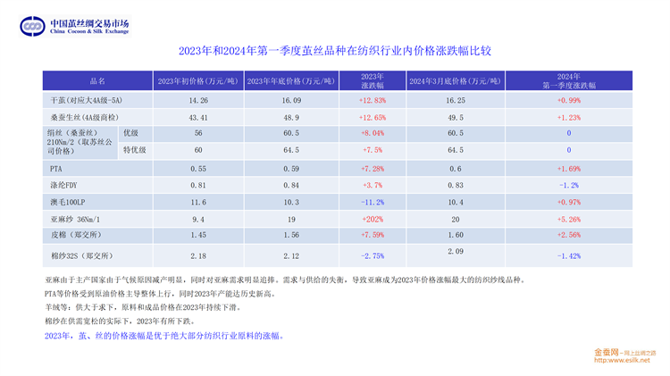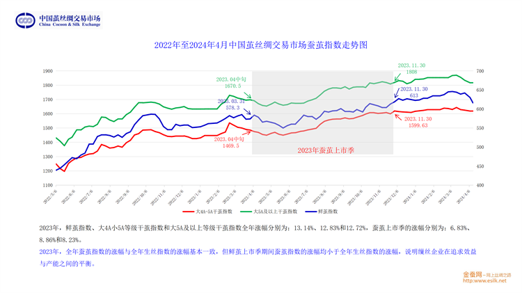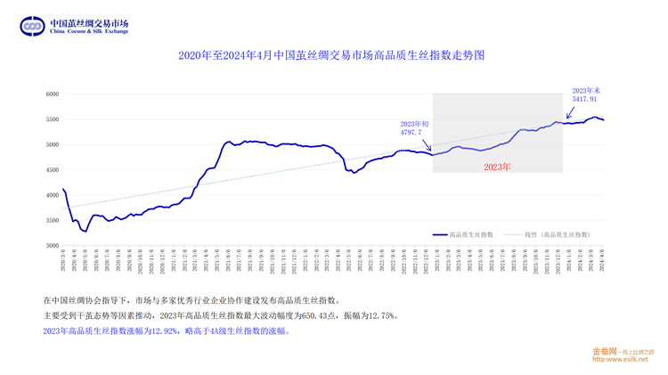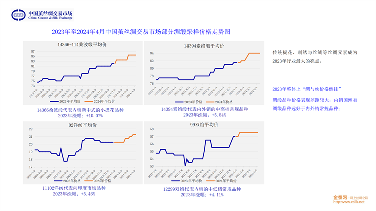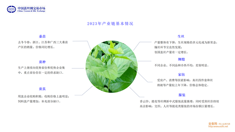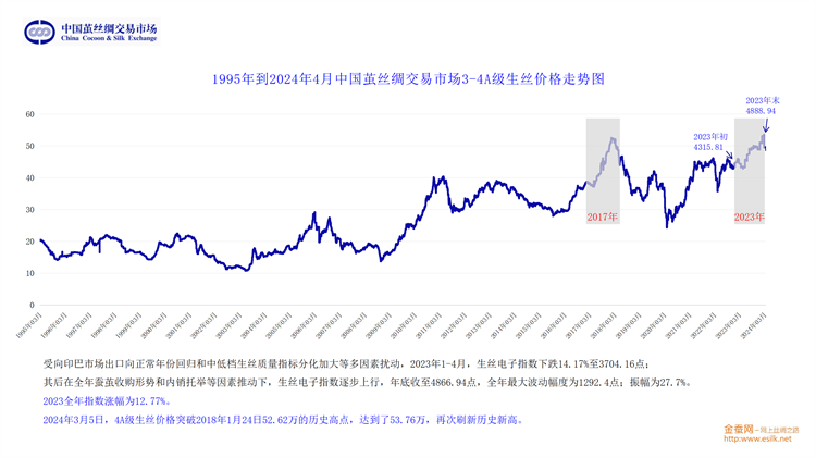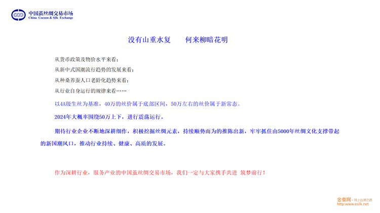 最后,從貨幣政策及物價水平、新中式國潮流行趨勢的發(fā)展、種桑養(yǎng)蠶人口老齡化趨勢和行業(yè)自身運行的規(guī)律等多方面綜合,劉董認(rèn)為,以4A級生絲為基準(zhǔn),2024年大概率圍繞50萬上下,進行震蕩運行。他期待行業(yè)企業(yè)不斷地深耕細作,積極挖掘絲綢元素,持續(xù)順勢而為地推陳出新,牢牢抓住由5000年絲綢文化支撐帶起的新國潮風(fēng)口,推動行業(yè)持續(xù)、健康、高質(zhì)的發(fā)展。